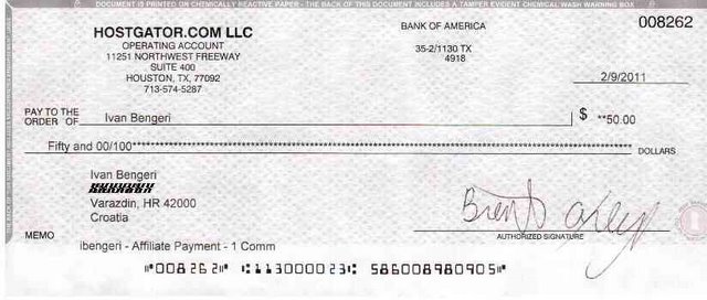 Naravno, tijekom ta dva mjeseca klijent (vaš referal) ne smije otkazati svoj hosting paket. Nakon što ga pošalju, ček na vašu kućnu adresu dolazi za nekoliko dana, a za jedan zakupljeni hosting preko vas on izgleda ovako: